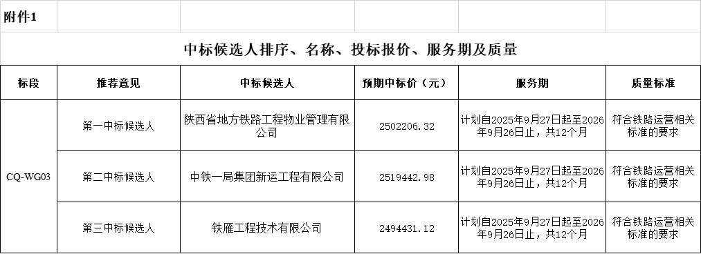 附件:1.中标候选人排序、名称、投标报价、服务期及质量