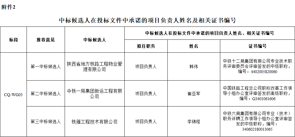 凤翔长青铁路专用线凤翔Ⅲ场铁路基础设施维管服务(第二次)在国内进行公开招标。项目法人凤翔长青铁路有限公司组织完成了评标工作,现将中标候选人公示如下: