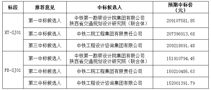 新建城际铁路西安至潼关线、法门寺至宝鸡线勘察设计在国内进行公开招标。项目法人陕西省铁路集团有限公司组织完成了评标工作。现将中标候选人单位公示如下: