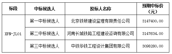 新建城际铁路西安至法门寺线控制性工程站前工程施工监理服务在国内进行公开招标。项目法人陕西西法(南线)城际铁路有限公司组织完成了评标工作。现将评标结果公示如下: